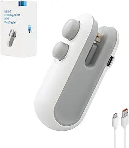 Feature Description Product Type USB Rechargeable Food Bag Sealer & Cutter Material ABS Plastic Charging USB (Rechargeable) Function Heat Sealing + Cutting Suitable For Plastic, Aluminum, Snack, Food Bags Color Random Size Compact & Portable Home, Office, Travel, Kitchen